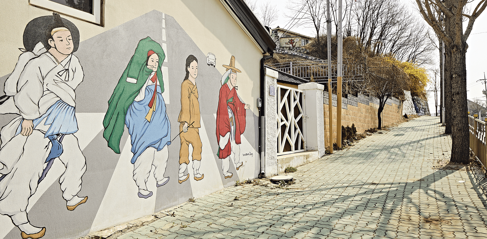 익살스러운 우리 고유의 민화로 마을 벽면을 채운 제천 교동민화마을은 제천시 중심부에 자리한다. 조용한 마을을 천천히 걸으며 만나는 벽화가 살며시 입가에 미소를 띠게 만드는 곳이다.