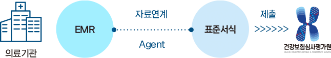 의료기관(EMR) -> 자료연계, Agent -> 표준서식 -> 제출(건강보험심사평가원)