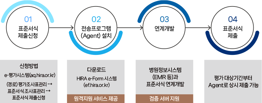 01 표준서식 제출신청(신청방법 e-평가시스템(aq.hira.or.kr)(경로) 평가조사표관리 ⇢ 표준서식 조사표관리 ⇢표준서식 제출신청) -> 02 전송프로그램(Agent) 설치(다운로드 HIRA e-Form 시스템(ef.hira.or.kr) 원격지원 서비스 제공) -> 03 연계개발 (병원정보시스템(EMR 등)과 표준서식 연계개발 검증 서버 지원) -> 04 표준서식 제출 (평가 대상기간부터 Agent로 상시 제출 가능)