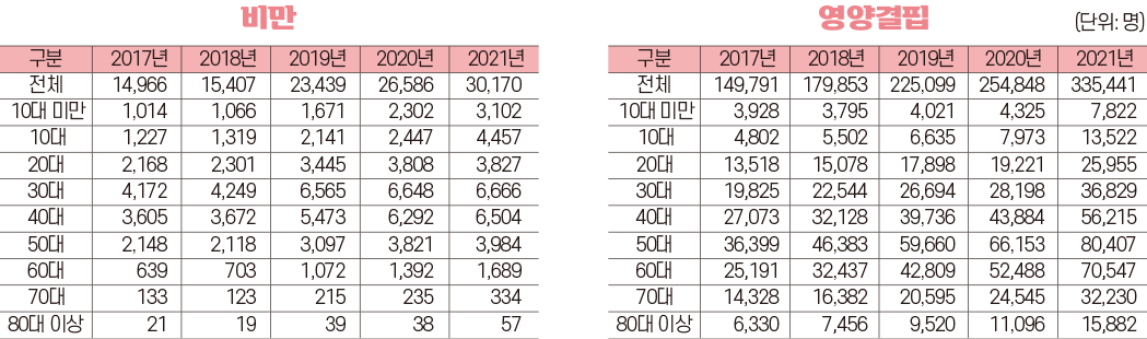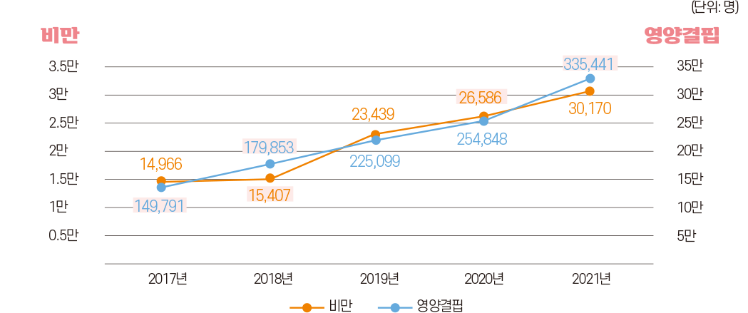 건강보험심사평가원 빅데이터 자료를 보면 비만과 영양결핍 환자수가 꾸준히 증가하고 있는 것을 확인할 수 있다.