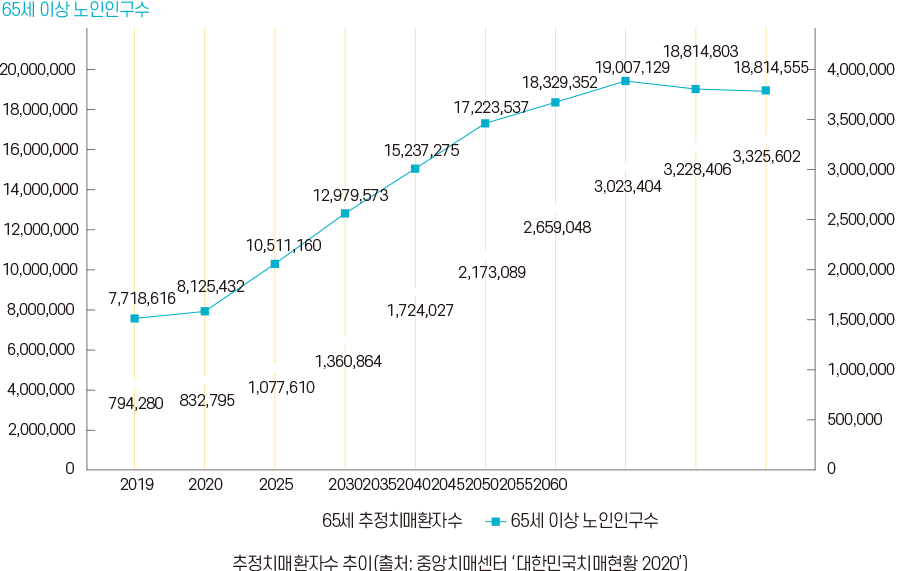치매는 매우 흔한 질병이다. 연령이 높아짐에 따라 유병률이 급격히 증가해 80세 이상 인구에서는 치매 환자가 40%에 달한다. 현재 65세 이상 노인인구는 800만 명이고, 치매 인구는 약 80만 명이다. 앞으로 전체 인구는 감소하지만 노인인구는 증가해서 2060년 우리나라 노인인구는 1,800만 명으로 예상되며, 추정 치매 환자수는 현재의 4배에 달하는 330만 명에 이를 것으로 보인다.