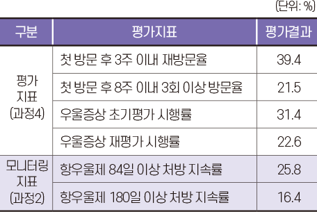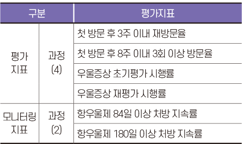 우울증은 우울감이나 의욕저하를 비롯해서 다양한 인지장애 및 정신·신체적 증상을 일으켜 일상기능의 저하를 가져올 수 있습니다. 그럼에도 사회적 편견 및 적절한 조기 치료 부족 등으로 인해 자살 등 정신보건 문제가 지속되고 있어 우울증 외래 적정성 평가를 통해 우울증 환자의 의료 접근성 및 치료 지속성을 높이고 근거 기반 의료서비스를 제공하고자 합니다.