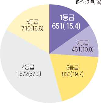 ㆍ1등급 기관 651기관(15.4%) 중 의원이 589기관(90.5%)으로 가장 많이 차지