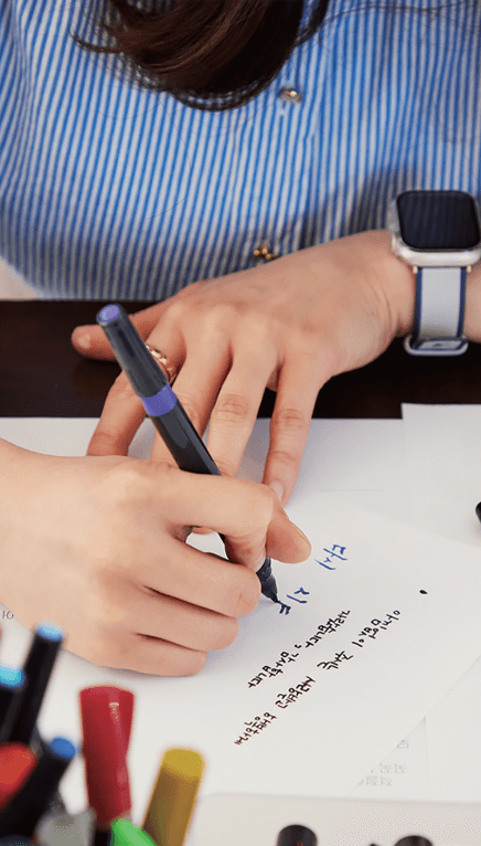 “예전에 캘리그래피 책을 사서 독학해본 적이 있어요. 책을 보면서 따라 했는데 제대로 하고 있는 건지, 이게 맞는지 알 수 없어 아쉬웠어요. 오늘 이렇게 전문가에게 바로바로 피드백을 받으니 어떻게 써야 할지 감이 잡힙니다. 재미있어요.”