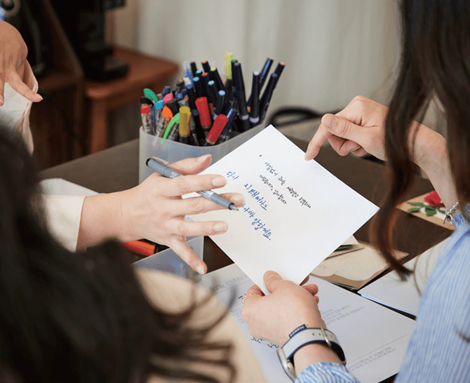 김영진 대리는 카드에, 이슬기 대리는 봉투에 부모님에게 감사의 마음을 전하는 문구를 정성껏 썼다. 이슬기 대리는 공방에 전시되어 있던 좋은 글귀를 보며 위로받았다고 말한다.