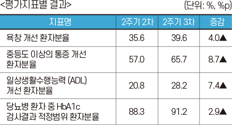 ○ 특히 ‘중등도 이상의 통증 개선 환자분율’은 57.0%에서 65.7%로 8.7%p, ‘당뇨병 환자 중 HbA1c(당화혈색소) 검사결과 적정범위 환자분율’은 88.3%에서 91.2%로 2.9%p 증가되었습니다.