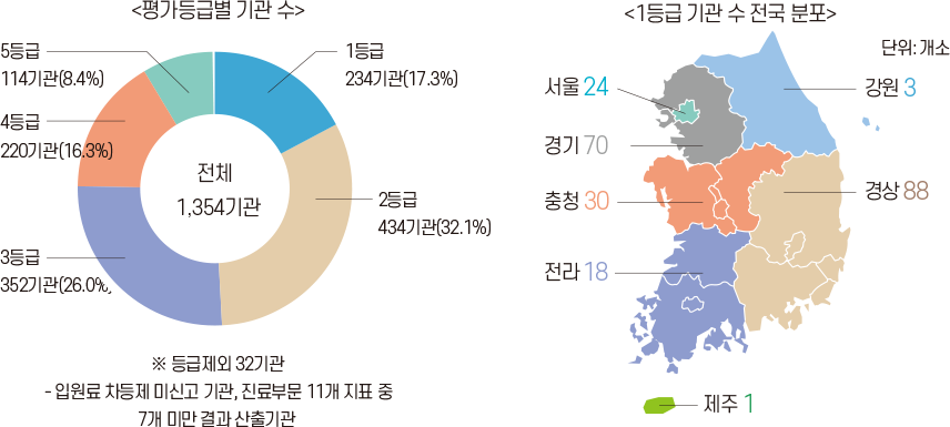 ○ 2주기 3차 평가대상인 1,354기관 중 1등급은 234기관(17.3%)이며, 2등급은 434기관(32.1%)입니다.