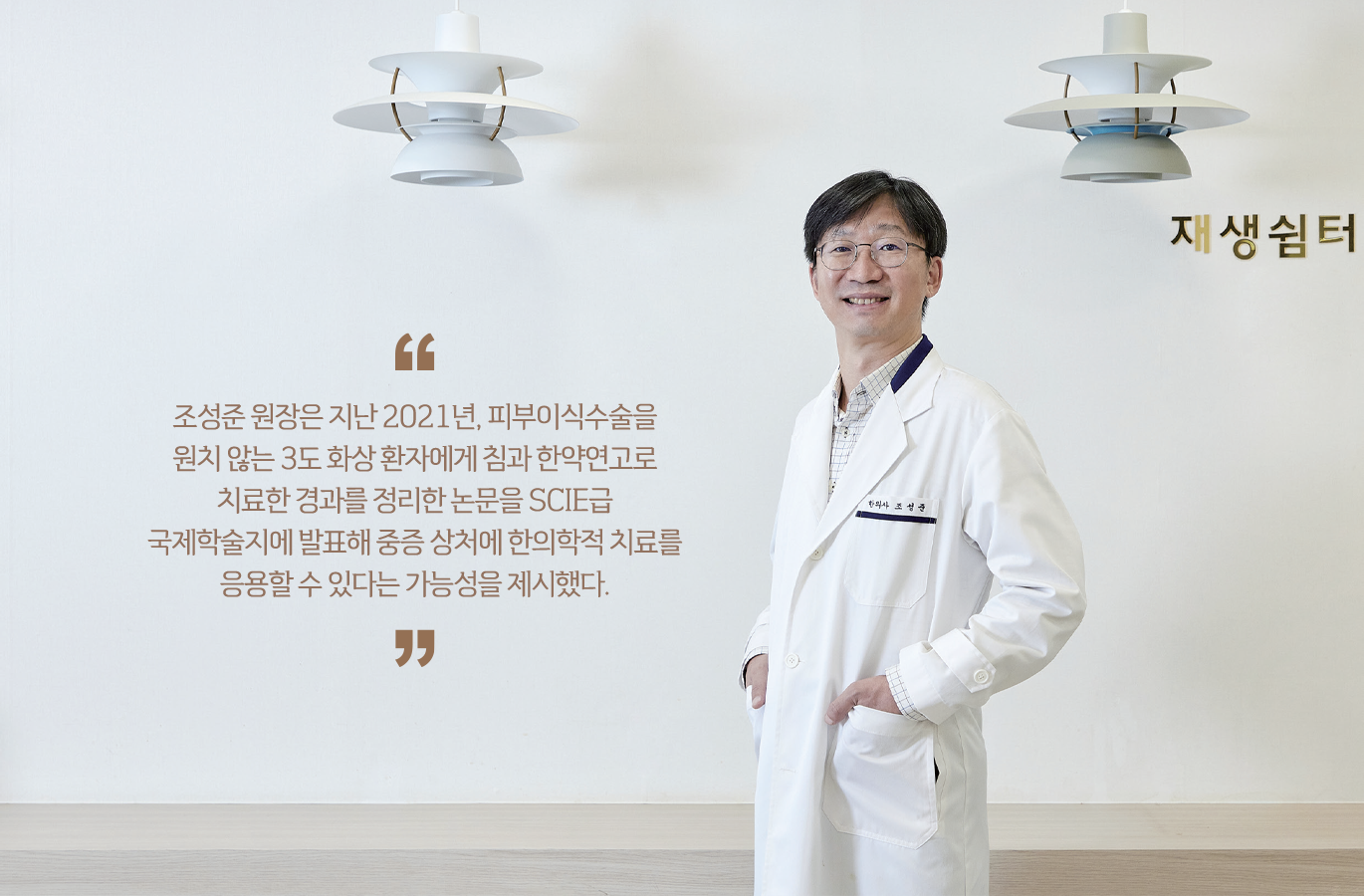 ‘한의원에서 화상치료가 가능하다?’ 결론부터 말하면, ‘가능하다.’ 자연재생한의원 조성준 원장이 지난 18년간 화상 환자 1만 명을 치료한 풍부한 임상경험이 이를 뒷받침한다. 또 한의학적 상처 치료의 우수성을 알리고자 ‘3도 화상 환자에게 침과 한약연고로 치료한 경과를 정리한 증례’를 SCIE급 저널에 발표하는 등 한방 상처 치료가 낯선 이들을 위해 과학적 검증 작업을 전개해오고 있다. 화상, 욕창, 피부괴사를 비롯한 다양한 외상 환자들에게 한의 치료로 희망을 전하는 조성준 원장은, 상처 치료가 필요한 환자들에게 다양한 선택권이 주어졌으면 하는 바람을 전한다.