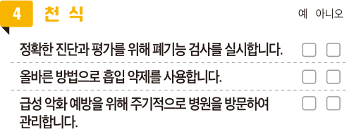 ① 고혈압 ② 당뇨병 ③ 항생제사용 ④ 천식 ⑤ 만성폐쇄성폐질환
