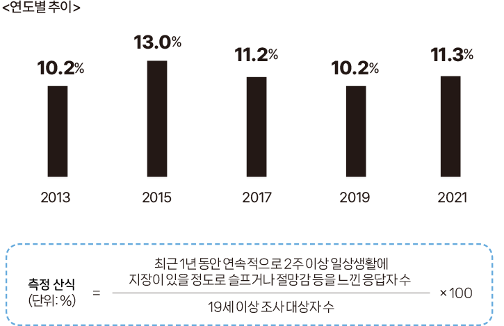 성인 인구 중 최근 1년 동안 연속적으로 2주 이상 일상생활에 지장이 있을 정도로 슬프거나 절망감 등을 느낀 사람의 비율