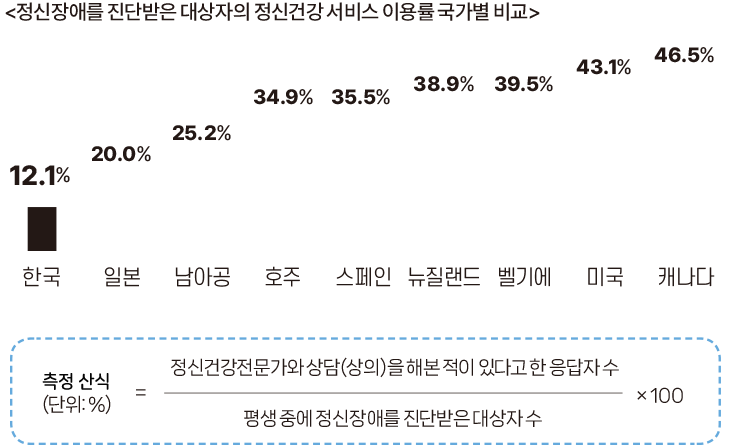 · 분모: 평생 중에 정신장애진단도구(K-CIDI 2.1)로 검사해 알코올 사용장애, 니코틴 사용장애, 우울장애, 불안장애 중 어느 하나라도 진단된 대상자