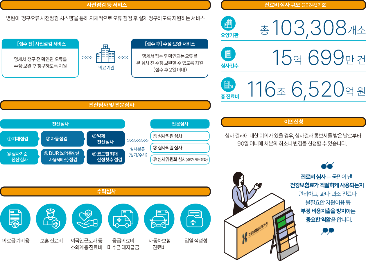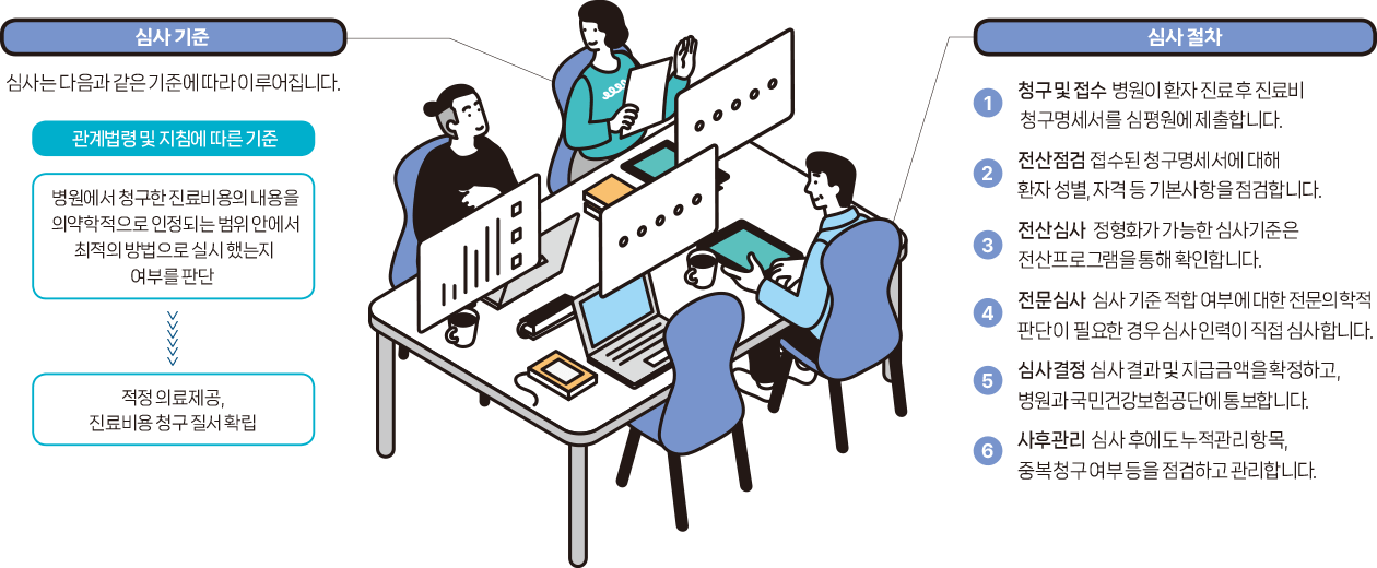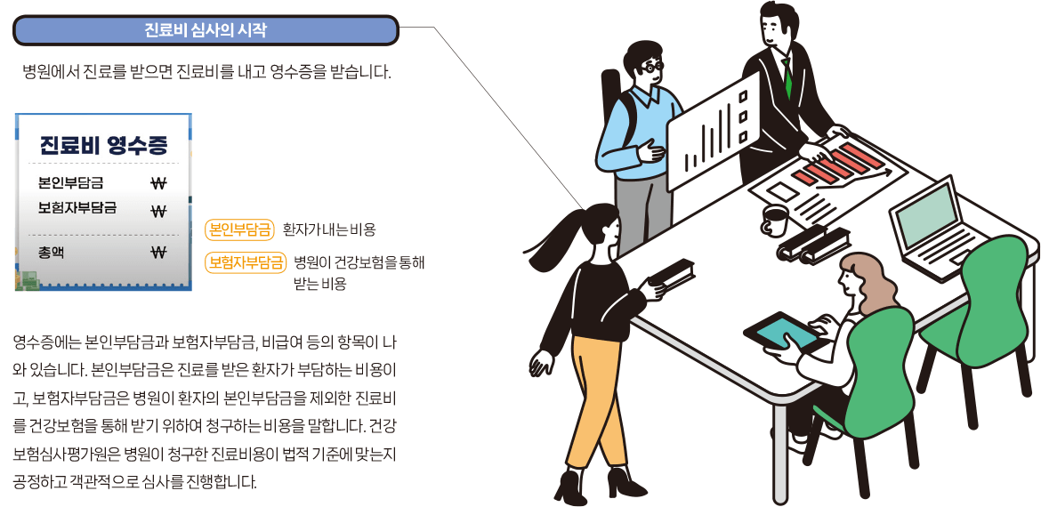 건강보험심사평가원에서는 과다·과소 진료, 불필요한 자원이용 등 부정 비용지출 방지를 위해 진료비용의 적정 여부를 심사하는데요, 국민이 낸 건강보험료가 제대로 쓰이는지 관리하는 것이 건강보험심사평가원의 중요한 업무 중 하나랍니다. 그렇다면 진료비 심사가 무엇이고, 또 어떻게 진행되는지 알아볼까요?
