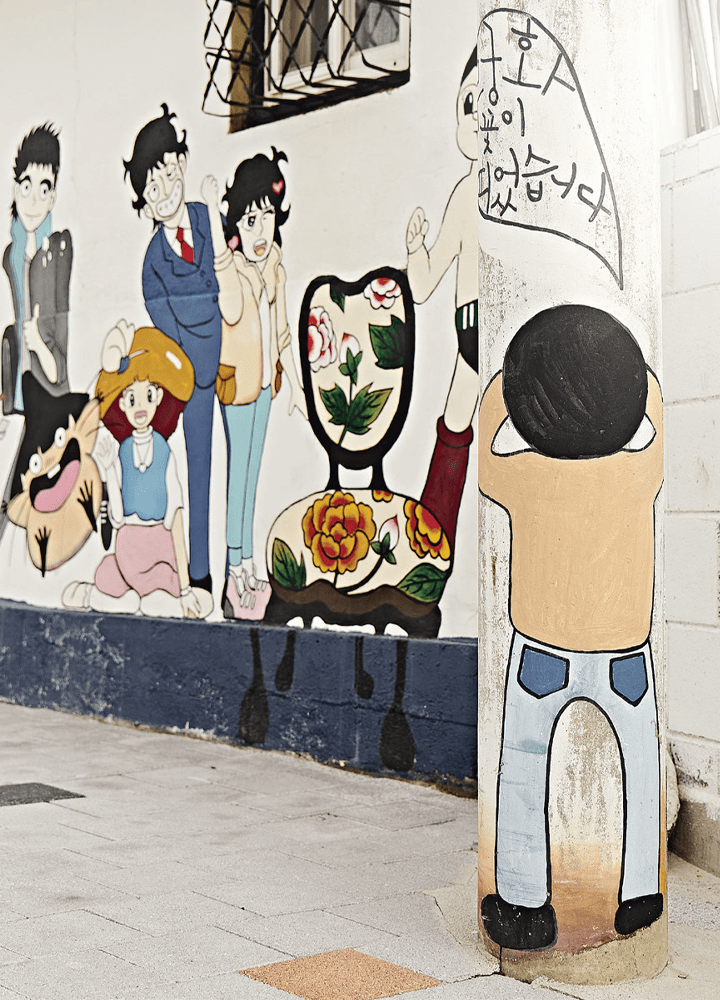 익살스러운 우리 고유의 민화로 마을 벽면을 채운 제천 교동민화마을은 제천시 중심부에 자리한다. 조용한 마을을 천천히 걸으며 만나는 벽화가 살며시 입가에 미소를 띠게 만드는 곳이다.