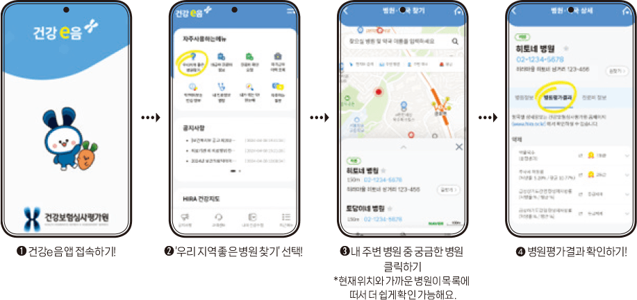 나: 오호~ 그럼 스마트폰에서 건강e음 앱을 내려받아야지. 어디 보자~ 오 여기 있다. 우리 지역 좋은 병원 찾기.