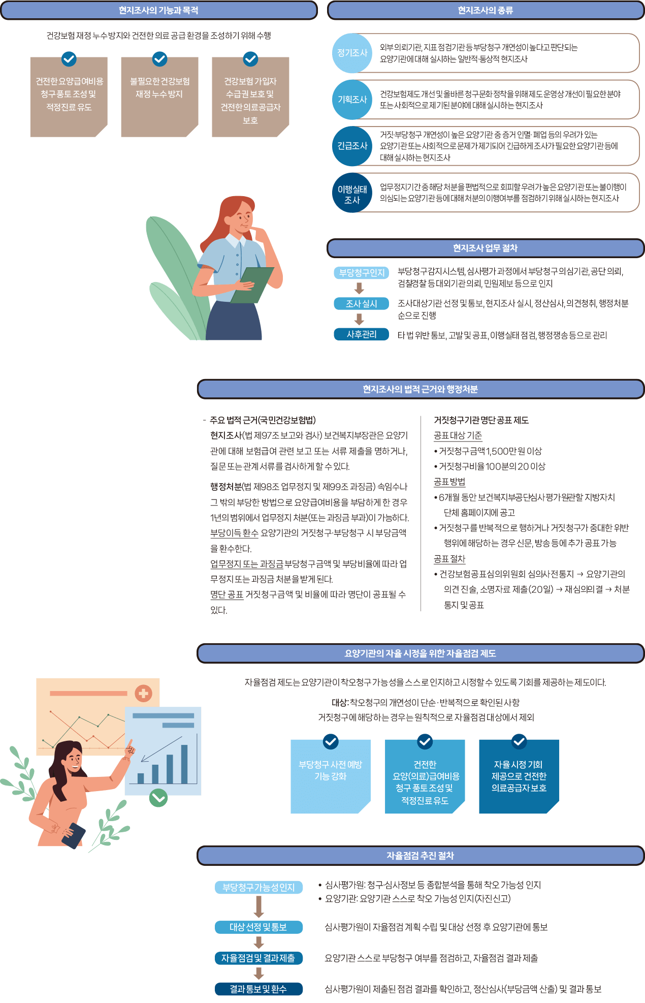 현지조사란 요양(의료급여)기관이 지급받은 요양급여비용 등에 대해 세부 진료내역을 근거로 사실관계와 법령, 각종 고시 등 급여기준과의 적합 여부를 확인·조사하고, 그 결과에 따라 부당이득 환수 및 행정처분 등을 실시하는 보건복지부장관의 행정조사를 말한다.