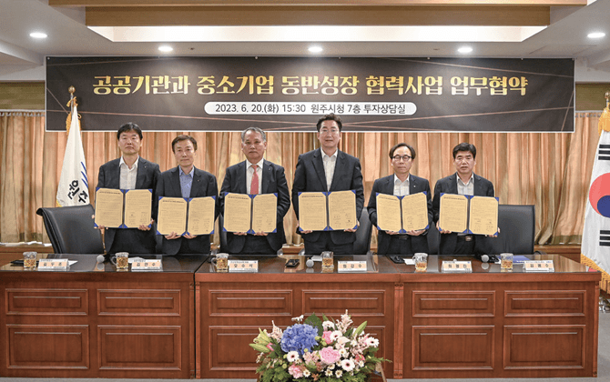 6월 20일, 원주시청에서 ‘공공기관·중소기업 동반성장 협력사업’ 추진을 위한 업무협약을 체결했다. 원주 혁신도시 공공기관 등이 마련한 예탁금을 기반으로 , 원주시·IBK기업은행 협업을 통해 지역 중소기업에 저리 대출을 지원할 예정이다. 주요 내용은 동반성장 협력사업을 위한 네트워크 구성·운영, 지역기업 대출이자 지원, 중소기업과 상생발전 협력에 관한 사항 등이다.