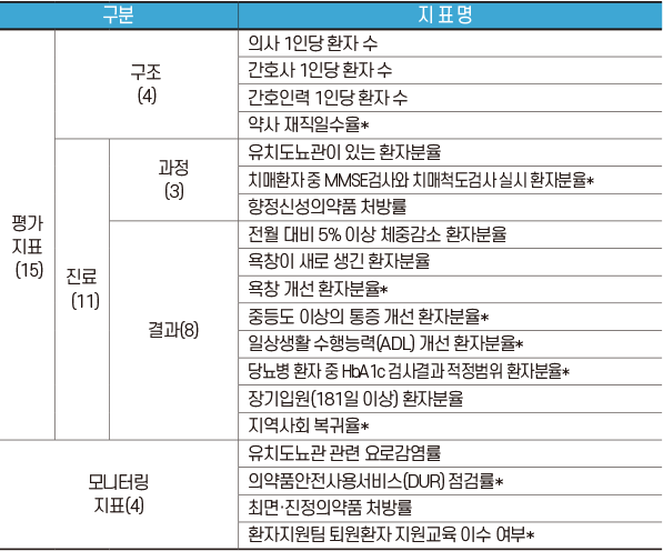 ○ 요양병원에서 제공하는 의료서비스에 영향을 미치는 구조영역 4개 지표, 진료영역 11개 지표, 모니터링 4개 지표 등 총 19개 지표가 평가 대상입니다.
