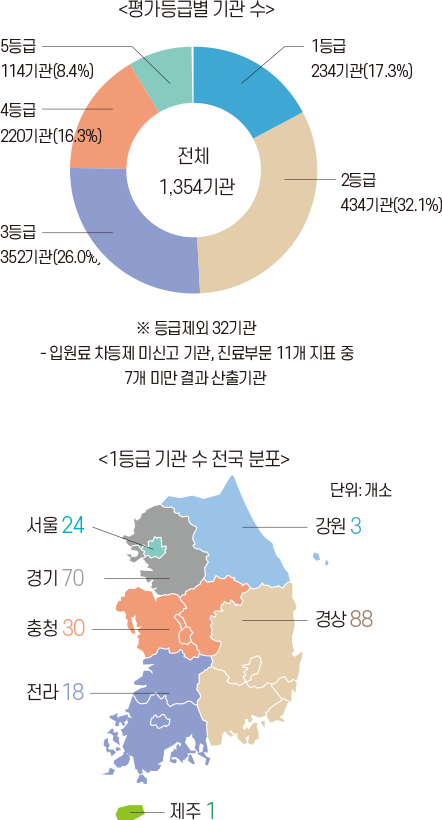 ○ 2주기 3차 평가대상인 1,354기관 중 1등급은 234기관(17.3%)이며, 2등급은 434기관(32.1%)입니다.